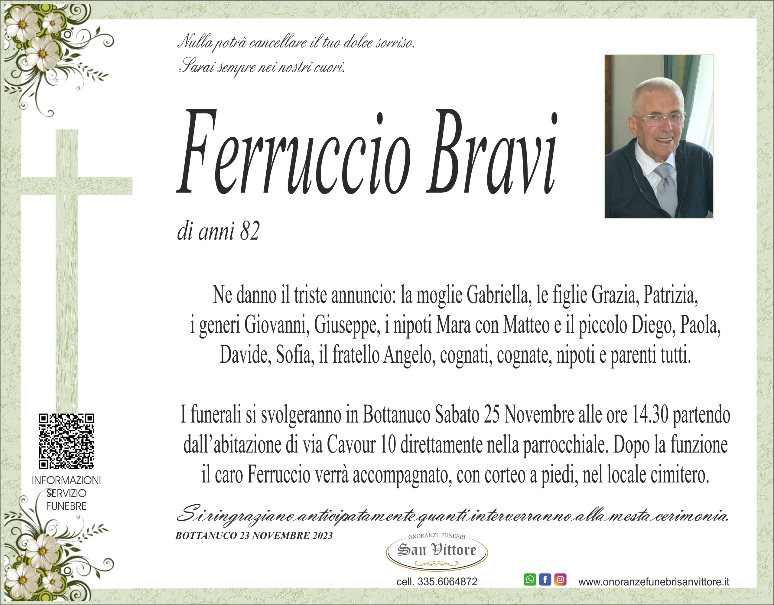I funerali si svolgeranno in Bottanuco Sabato 25 Novembre alle ore 14.30 partendo dall’abitazione di via Cavour 10 direttamente nella parrocchiale. Dopo la funzione il caro Ferruccio verrà accompagnato, con corteo a piedi, nel locale cimitero.