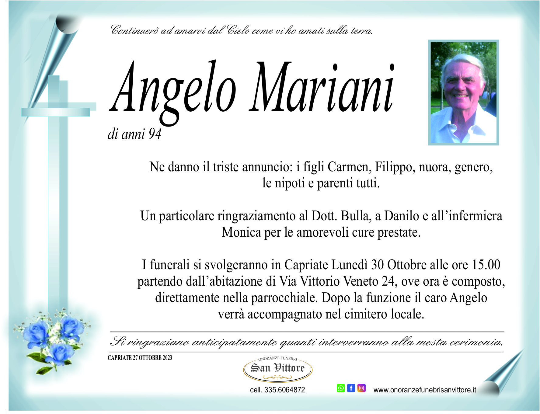 I funerali si svolgeranno in Capriate Lunedì 30 Ottobre alle ore 15.00 partendo dall’abitazione di Via Vittorio Veneto 24, ove ora è composto, direttamente nella parrocchiale. Dopo la funzione il caro Angelo verrà accompagnato nel cimitero locale.